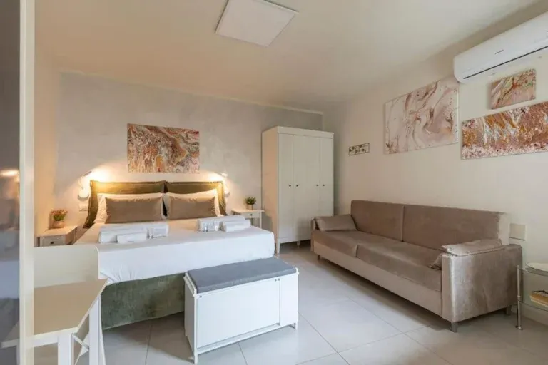 Appartamento con ingresso privato, cucina attrezzata di tutto, piano cottura a induzione, lavastoviglie, lavatrice, smart TV, letto matrimoniale grande, divano letto singolo, più lettino per un bambino, balcone con salottino per una colazione all’aria aperta in relax.