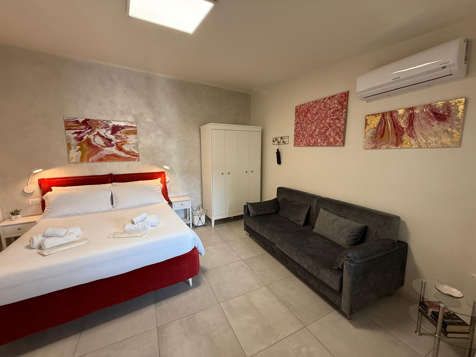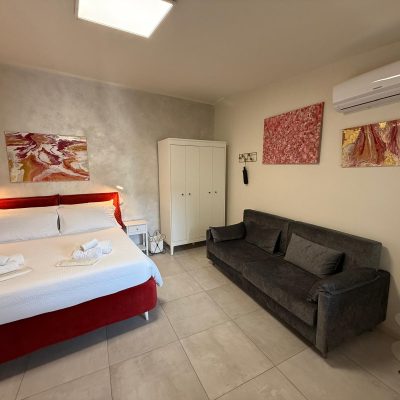 – Divano letto aggiuntivo: Divano letto trasformabile in un comodo letto matrimoniale con materasso in memory.